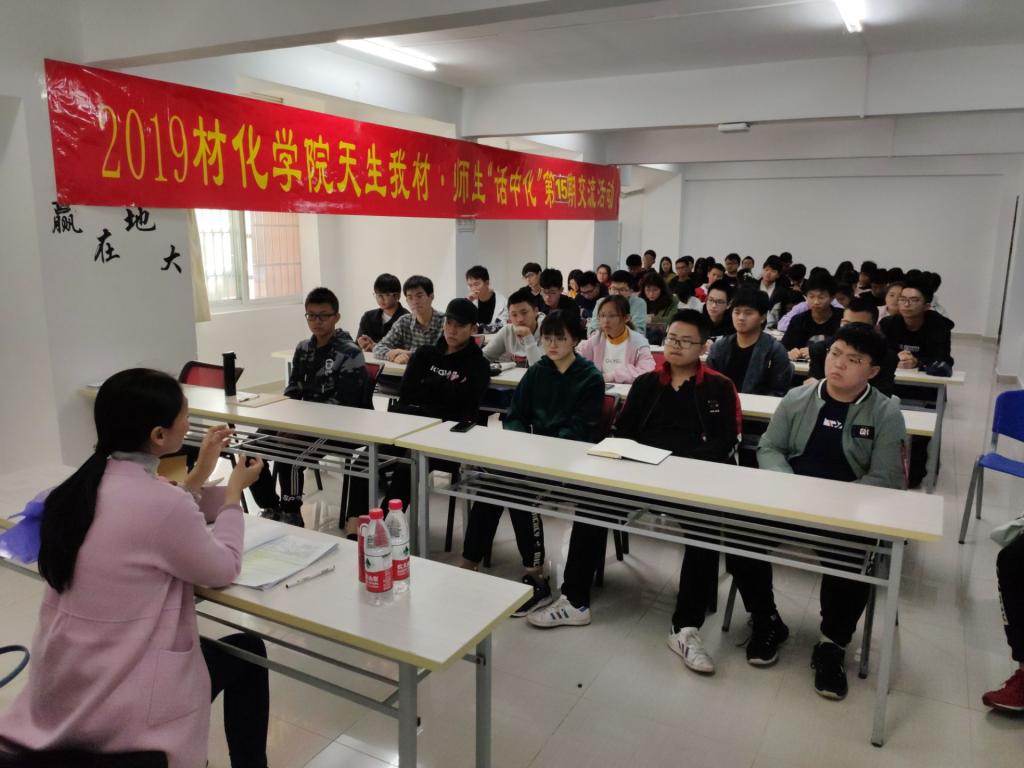 2019年11月14日下午,太阳集团2138天生我材·师生“话中化”第十五期交流活动在南望山校区大学生学习支持中心4号学习室顺利举行。本次交流活动邀请到了材化学院材料系马睿老师,她以《材料科学与工程,不再热门了吗?》为题与同学们进行了深入交流。