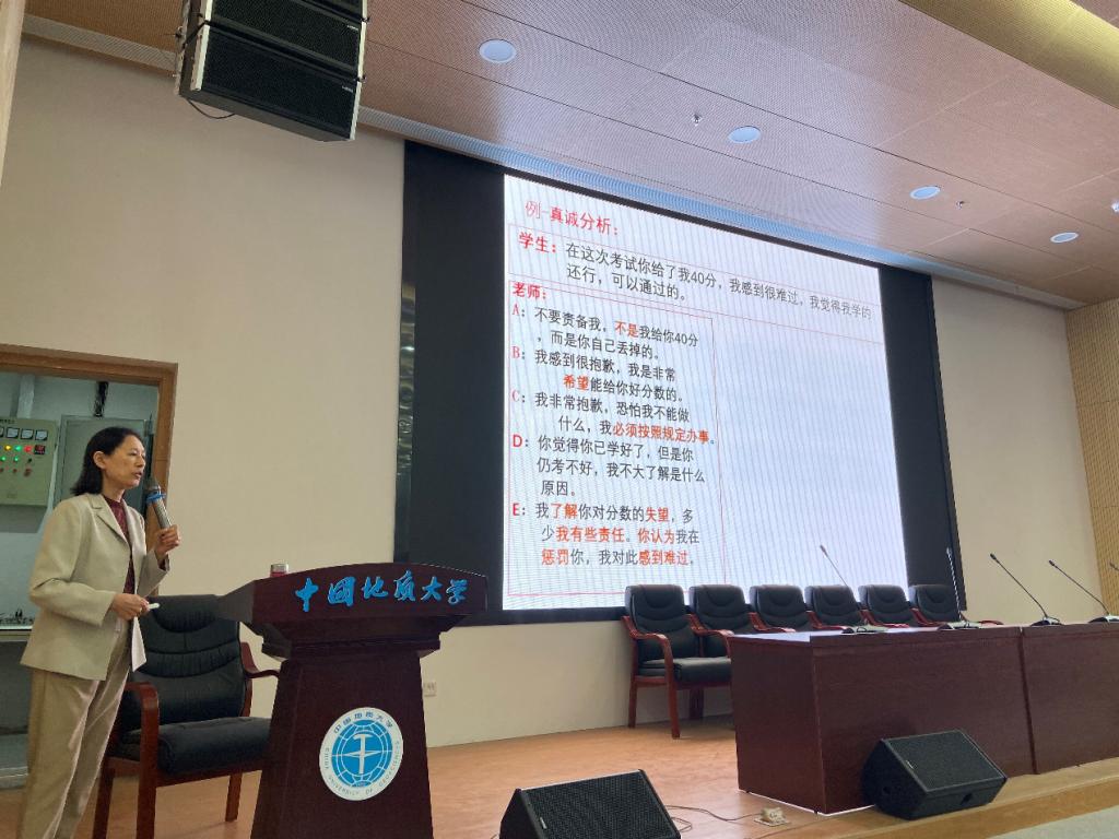 郭兰讲话,以如何更好的实现师生沟通为主题做了深入浅出的讲解。她分享了与学生进行有效沟通、对话的方式、方法以及原则。她着重指出,沟通一定本着真诚原则,要客观看待学生个人特点,挖掘个人积极正向的资源,建立平等互动的对话关系,积极引导学生自主解决问题;要理解青年学生需要被欣赏、被肯定的心理,要善于发现学生的优势、资源与力量,促进健康成长。