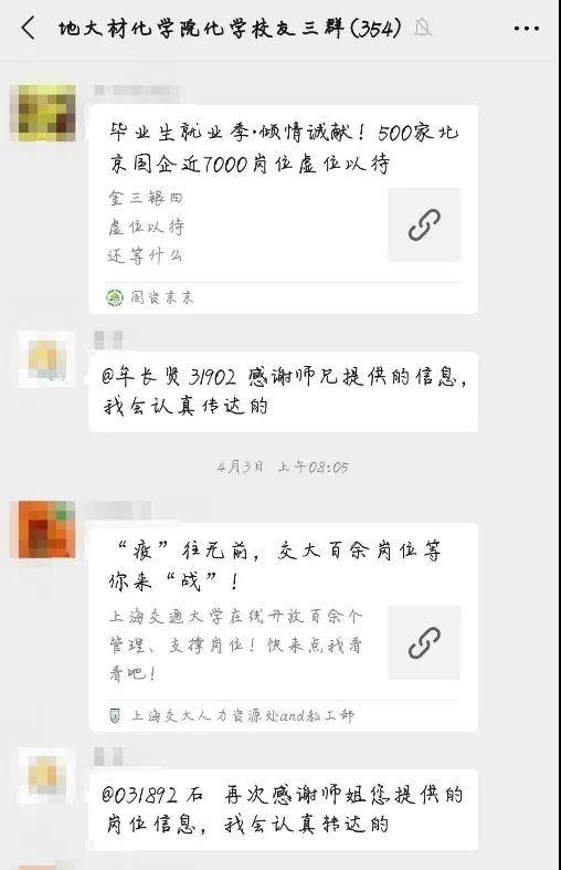 活动期间,采取一对一责任制,一名社团成员就是一座桥梁。在每个校友群安排一名社团成员作为负责人,收集校友们分享的招聘信息,并及时分类、汇总,转发到毕业生就业互助群中供毕业生选择。如有毕业生有意向,社团成员会做好毕业生和校友之间的沟通桥梁,并定期跟进落实应聘进展情况,做好记录。