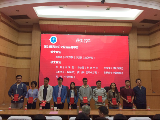 大会针对在各类研究生创新实践类赛事上斩获佳绩的个人和团体代表进行了表彰。我院2017级博士生李海涛、2015级硕士生胡策策以及2016级硕士生陈志雯在第二十八届研究生科技论文报告会上表现突出,分别在博士会场和硕士会场拔得头筹,荣获“特等奖”,作为研究生代表获得表彰。