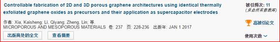 基本科学指标数据库(ESI)最新统计数据显示,我院夏开胜副教授(第一作者)、周成冈教授(通讯作者)等2017年在国际分子筛协会官方期刊《Microporous and Mesoporous Materials》上发表的学术论文“Controllable fabrication of 2D and 3D porous graphene architectures using identical thermally exfoliated graphene oxides as precursors and their application as supercapacitor electrodes”于2018年1月入选ESI全球高被引论文(前1%),中国地质大学(武汉)太阳集团2138为唯一通讯单位。