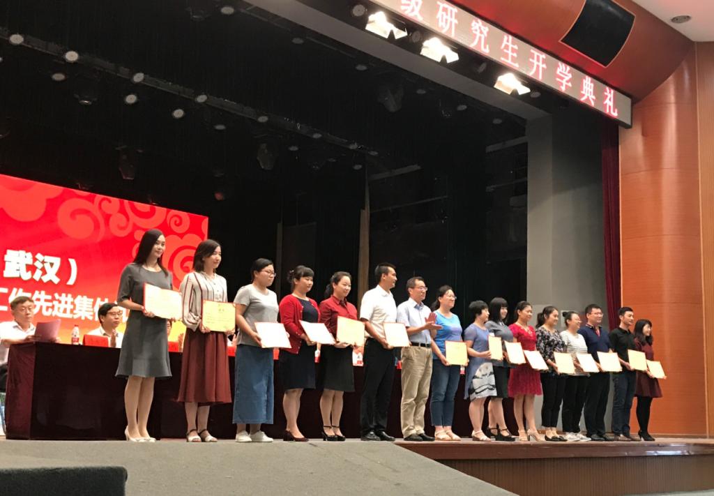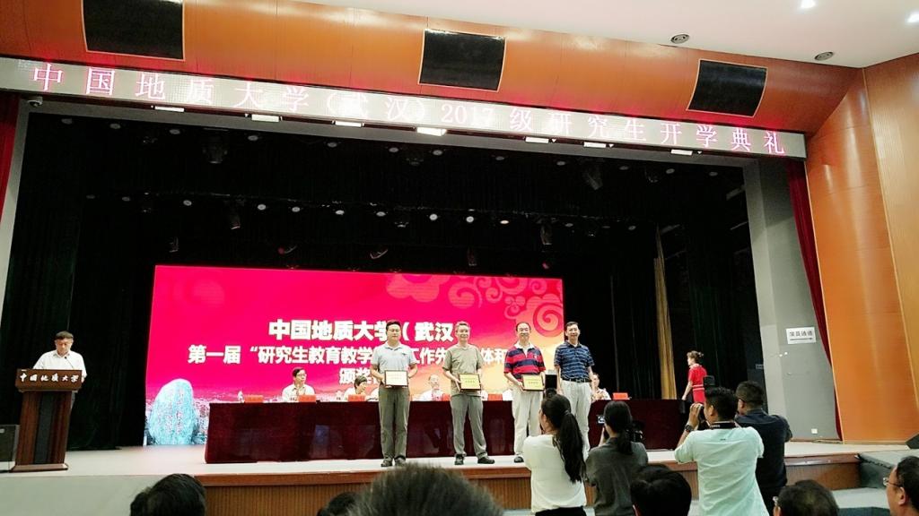 (通讯员:邹玮、白振洋) 2017年9月11日下午, 中国地质大学(武汉)2017级研究生新生开学典礼在西区弘毅堂隆重举行。在校校领导、院士出席。开学典礼上,学校对评选出的第一届研究生教育教学管理工作先进集体和先进个人进行了表彰。太阳集团2138获得先进集体荣誉称号,成为获得表彰的三个培养单位之一。黄焱球副院长上台领奖。研究生秘书邹玮获得先进个人荣誉称号,也上台接受了奖状。