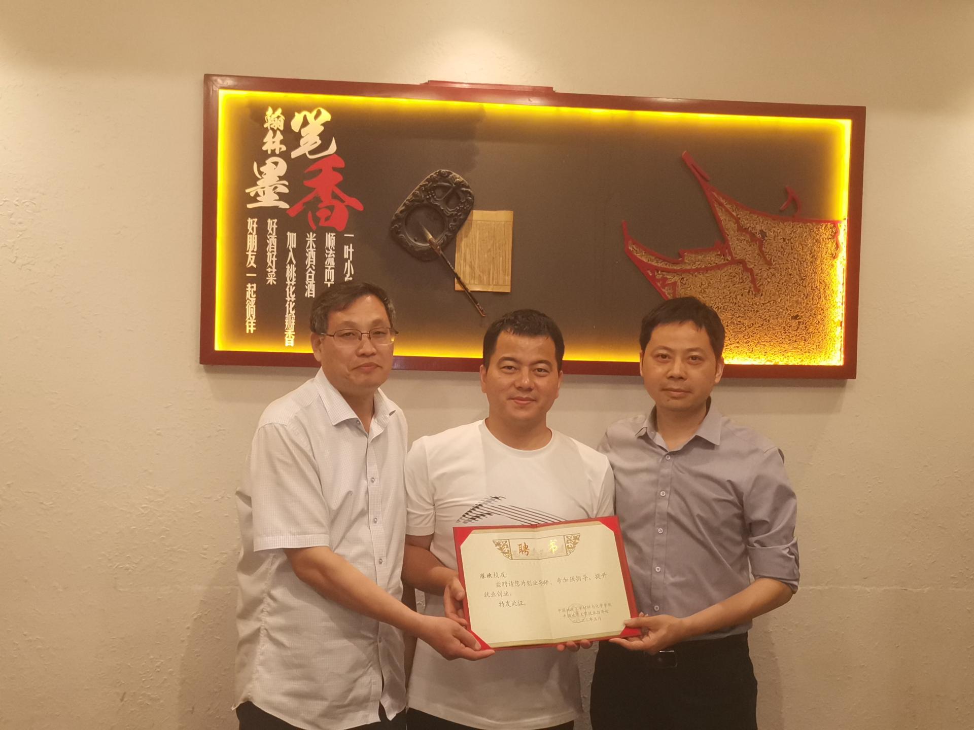 图为陈欢学长颁发创业导师聘书(左 刘世勇 中 陈欢 右 胡兆初)