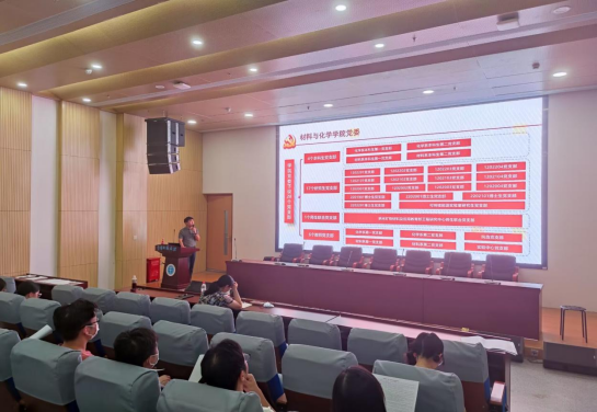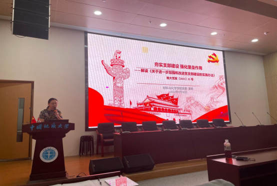 材料与化学学院党委书记黄菊老师以《夯实支部建设 强化堡垒作用》为题详细解读了学校党委《关于进一步加强和改进党支部建设的实施方法》。黄菊按照实施办法的具体要求分7个部分具体讲解,进一步明确党支部和支部委员工作职责,明晰支部建设工作制度,严格落实支部委员会建设要求,不断健全学生党支部工作体系。黄菊要求各支部以《中国地质大学(武汉)学生党支部考核评价指标体系》为准则,充分发挥战斗堡垒作用,以持续提升支部建设质量为重点,对标对表切实做到“七个有力”,提高支部战斗力。