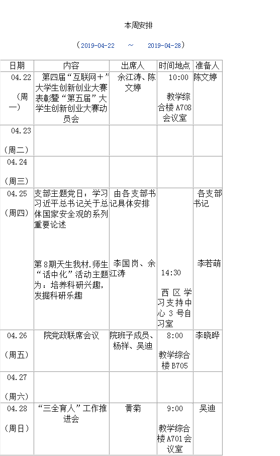 本周安排(2019-04-15 ~ 2019-04-21 )