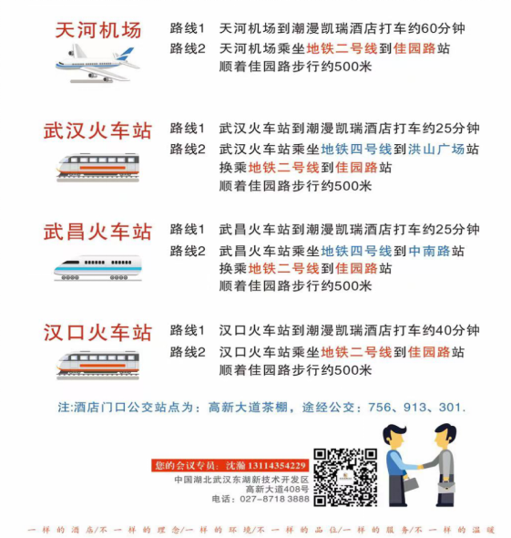参会人员如需在会议酒店住宿,可直接联系酒店会务负责人进行房间预订,订房时请报“矿物材料大会+姓名+单位”,以便酒店会务人员登记并享受订房协议价(普通标间、单间:369元/间/晚;豪华标间、单间:419元/间/晚;酒店会务负责人:沈经理,电话:13114354229)。 (2)疫情防控须知 会议前14天,参会人员(含会议代表和工作人员),自行实行健康状况监测,若有发热、咳嗽、胸闷等症状,原则上不参会。 会议注册时发放口罩;会议注册及办理酒店入住时,需用现场出示“健康绿码”;低风险地区人员可参会,来自境外和国内中、高风险地区人员原则上不参会,达到属地疫情防控健康管理要求的,持3天以内核酸检测阴性证明可参会;建议参会代表接种新冠疫苗。 七、位置及交通 1、报到地点:湖北省武汉市潮漫凯瑞国际酒店(武汉市洪山区高新技术开发区高新大道408号)。